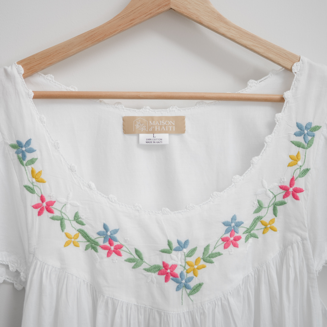 New!! A delightful, vintage-style take on our signature nightgown! Featuring intricate hand-stitched embroidery on soft, breezy cotton, the cap sleeve is edged with crocheted French thread. Each nightgown is hand-crafted from start to finish providing ample arm room and a hem that hits just above or at the knee.