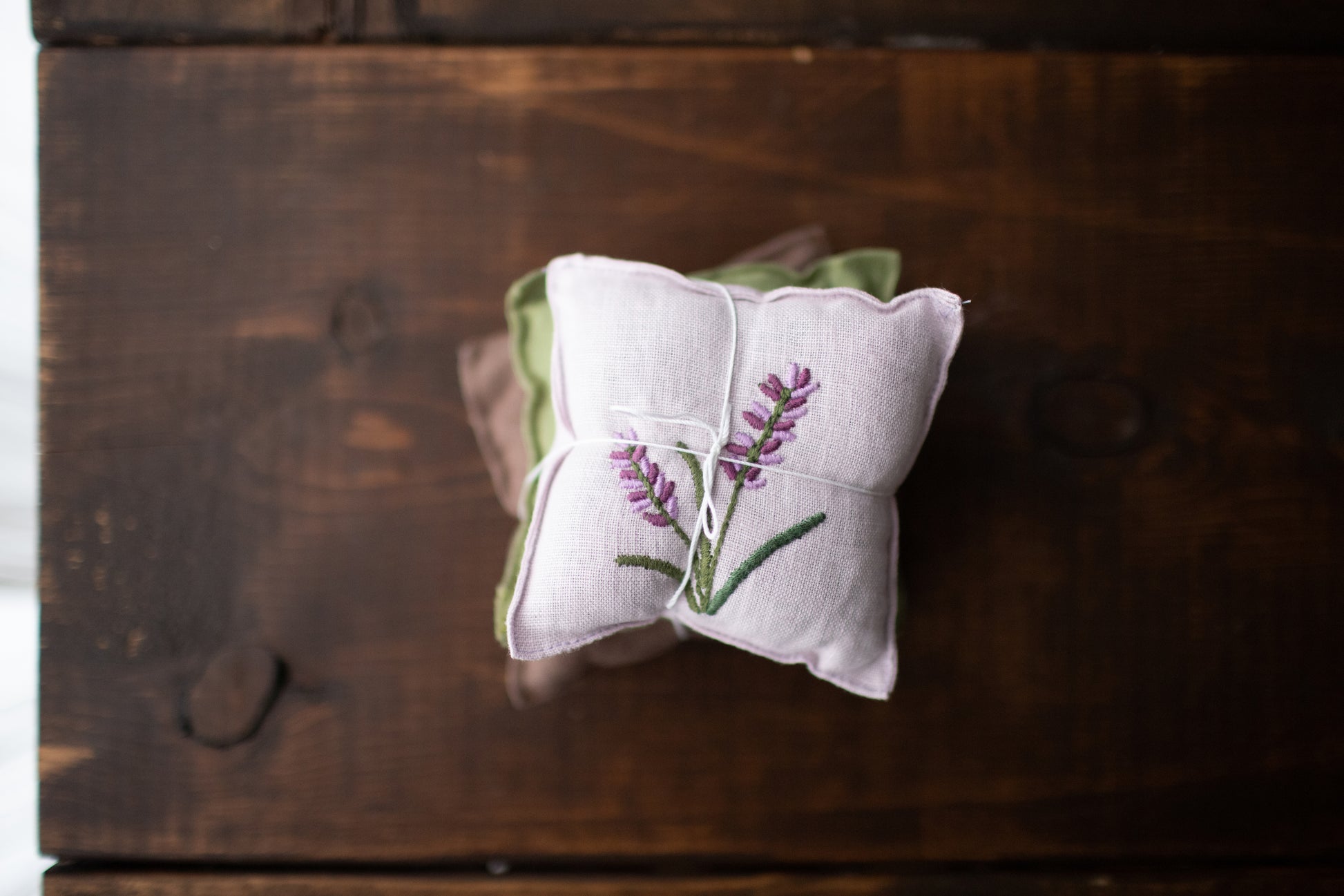 Our fan favorite lavender-filled sachet sets include a hand embroidered sachet paired with two complimenting, solid-colored sachets. The sachet set is bound together by cotton embroidery thread from France. This trio is sure to make your drawers, car, or linen closet smell of calming lavender scents.